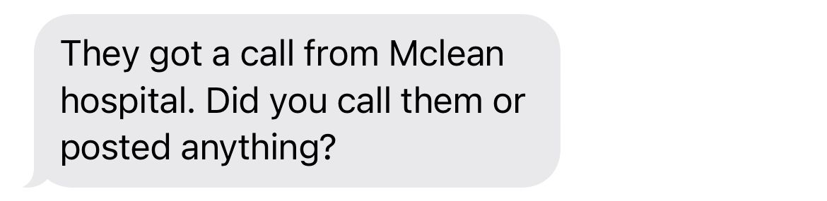 It wasn’t Kurt Brenner. It was a sane doctor. This guy is trying to kill me. If you’ve worked in mental health long enough, in clinical hospital settings like McLean and others you know that these are euphemisms for, let’s kill him and lock em up, then put his dead body in a pig field graveyard, which McLean started as, and call him a good patient!